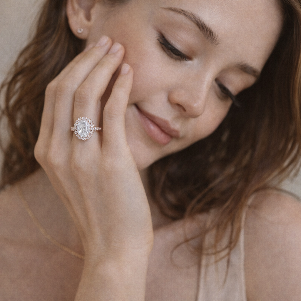 Verra Oval Halo Diamond Ring – Rose Gold Pavé Band